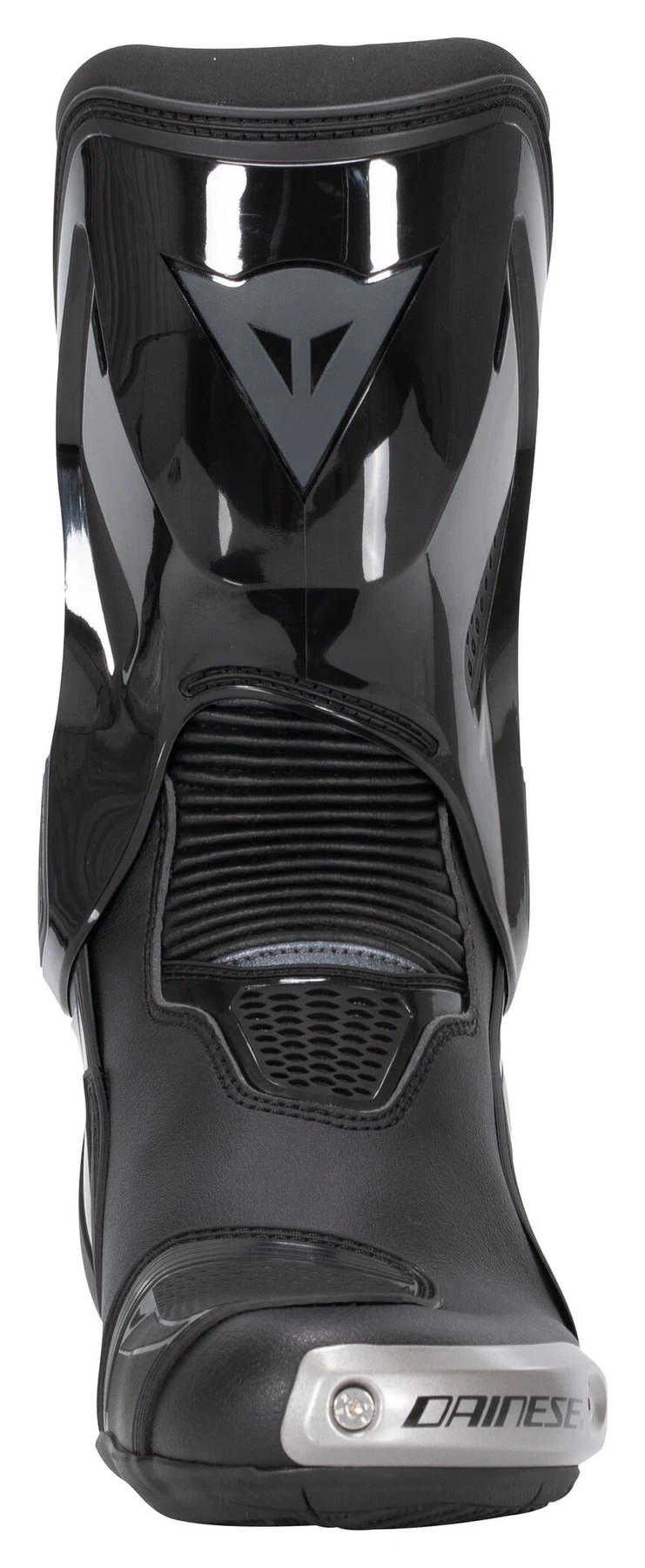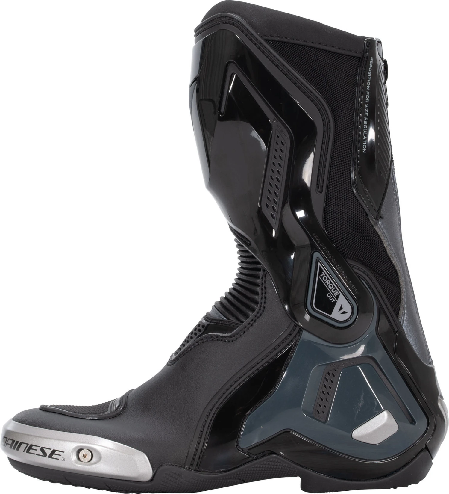 The Dainese *Torque 3 Out* is a genuine race boot, made of microfibre and D-Stone fabric. The soles of these motorcycle boots are equipped with special TPU panels for good grip on the track. Top comfort and protection are provided by the replaceable magnesium sliders, protective nylon on the shaft, heel and toe plus the exclusive D-Axial System made of TPU to protect your feet against torsion.